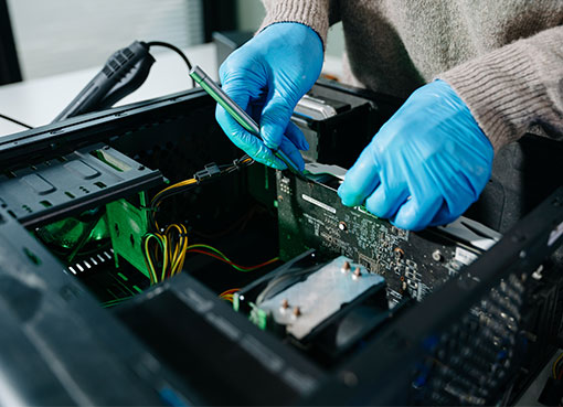 Fixing or replacing physical components like hard drives, power supplies, RAM, screens, fans, or motherboards. These repairs address issues such as computers not turning on, overheating, or hardware failure.